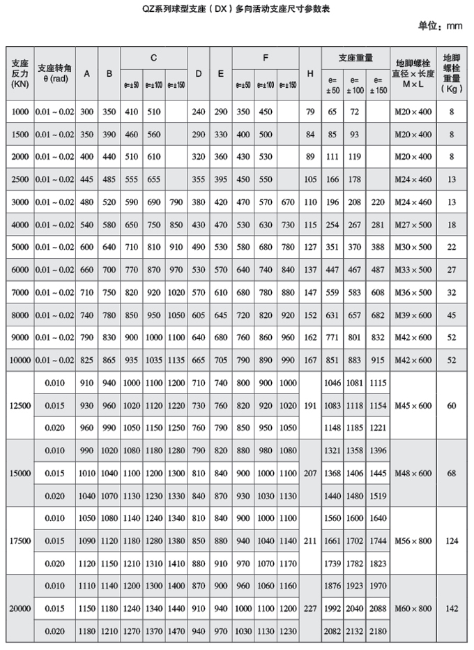 300Q—20000KN e= ± 50mm e= ± 100mm e= ± 150mm 橫橋向:(DX多向活動支座)e=±40mm 設(shè)計位移量根據(jù)工程需要可進行變更。